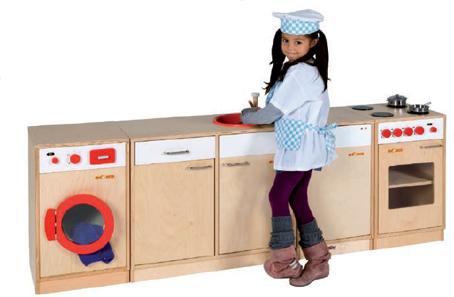Educo的廚房組室18mm後的樺木夾板所製作。櫥櫃櫃門都有內置的緩衝安全鍊,無論孩子多用力關門,們都會輕緩關上,以防夾到孩子們的手指。
