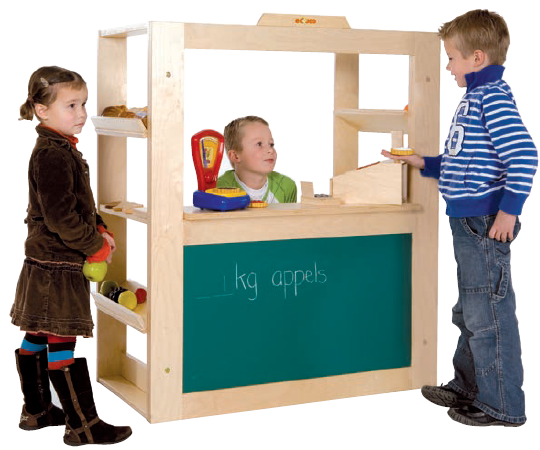 由木製小賣部由上了漆的樺木夾板製成,有架子的三面小賣部,有服務台還有黑板。(附屬配件需另購)